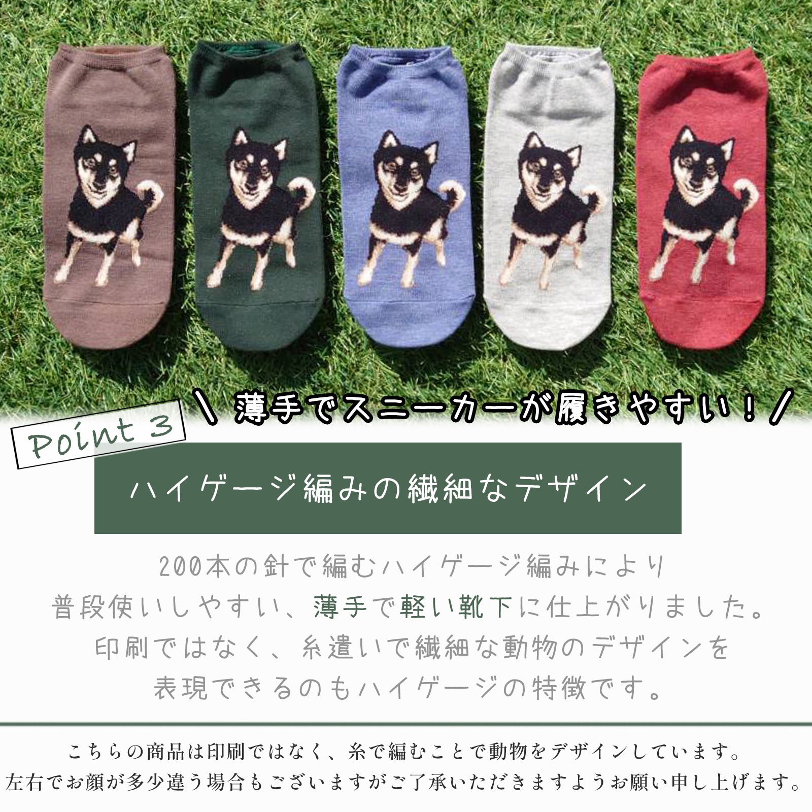 200本の針で縫う『ハイゲージ編み』を採用することで、きめ細かな描写と薄く軽い履き心地の両方を実現しました。何度も試作を繰り返しようやく完成した黒柴スニーカーソックスは、3足セットで1,000というお手頃価格!メール便(ポスト投函)で届くので、忙しい方でも受け取り楽々♪