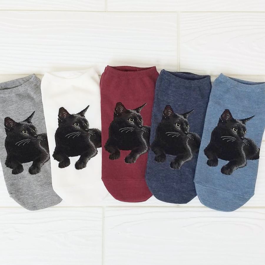かわいい黒猫柄のスニーカーソックスです。猫特有の香箱座りの姿を糸使いのみで再現しました。