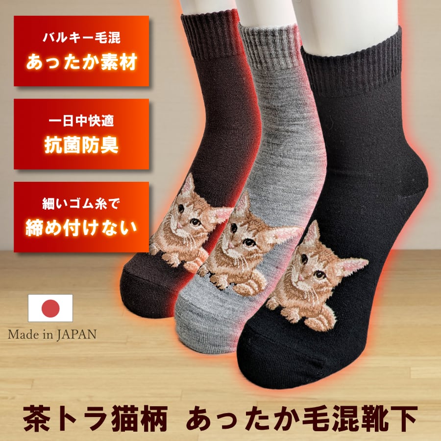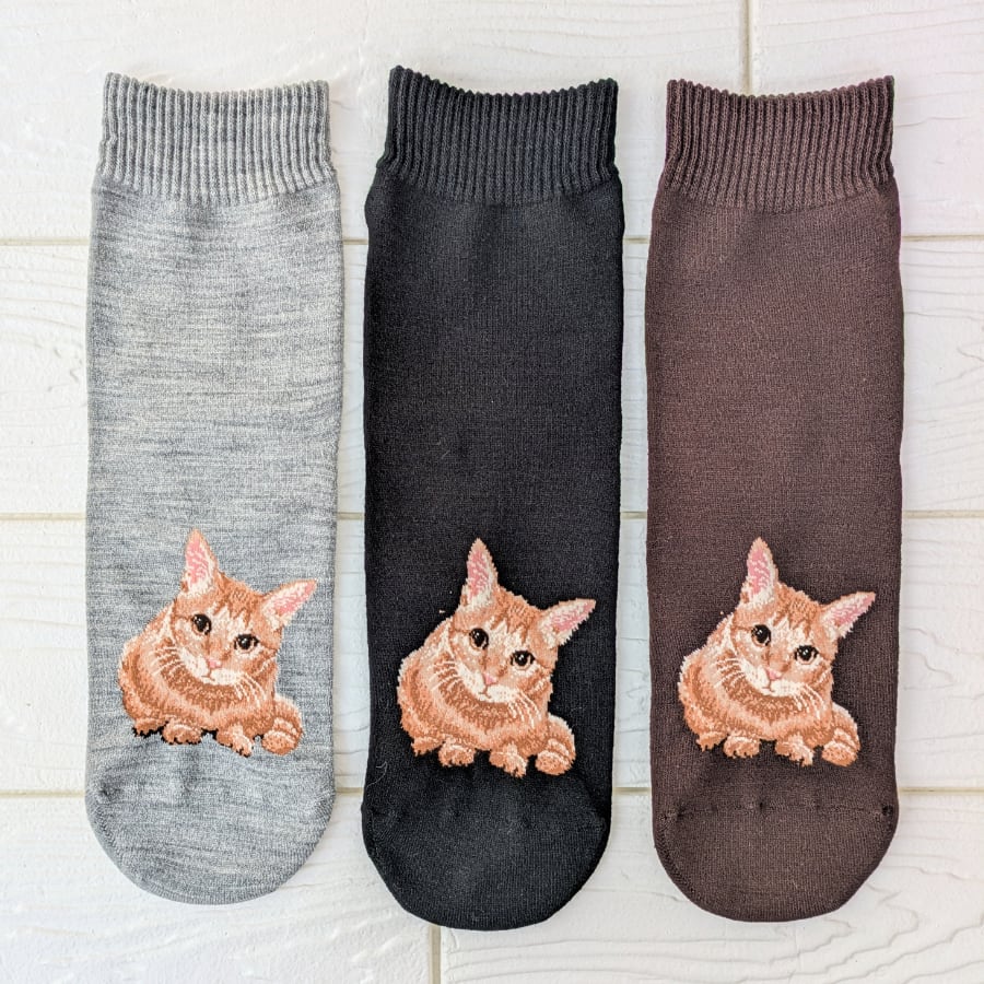 茶トラ猫柄 レディース クルー丈ソックス 選べる3足セット 日本製【52AW0219】