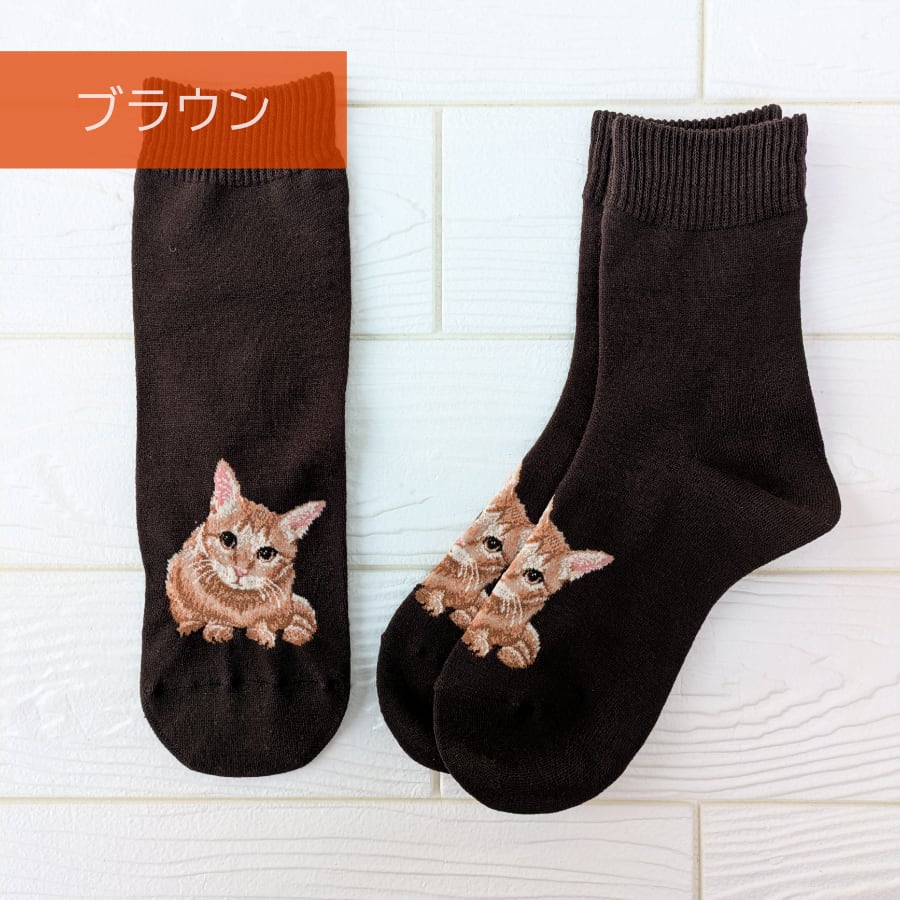 かわいい茶トラ猫の姿をリアルに再現したクルーソックス(レディース)です。柄は足の甲部分にあり靴を履いた状態では無地靴下のように見えます。