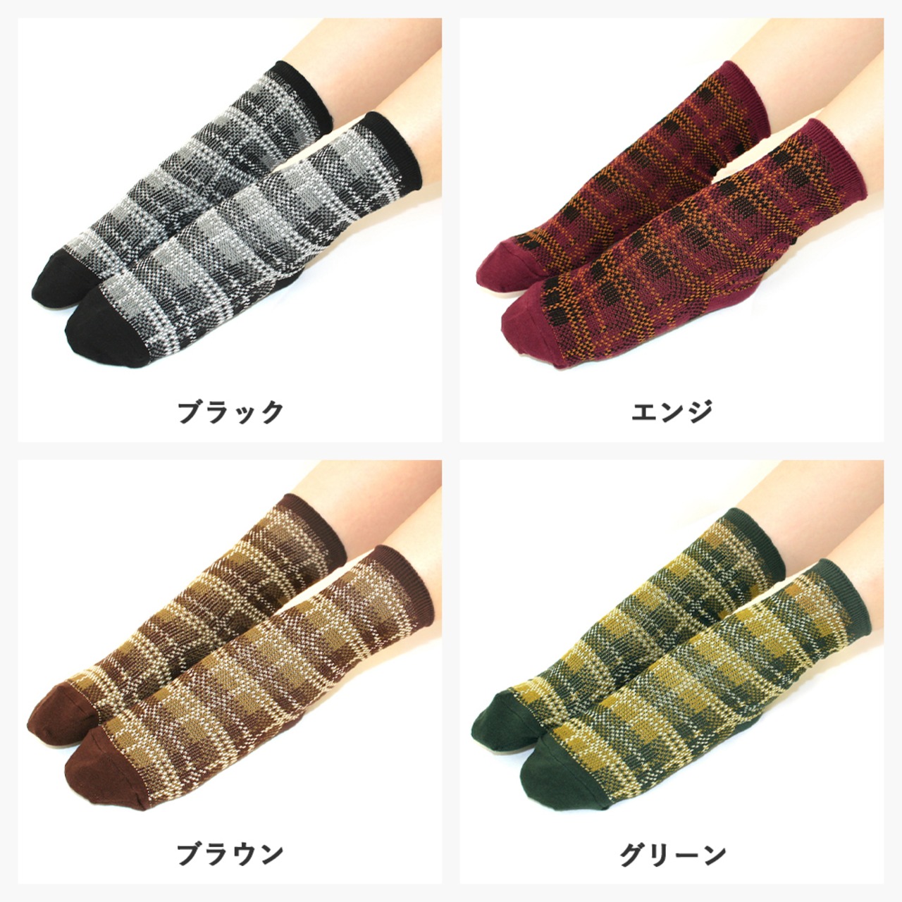 繊細で上品なチェック柄が魅力の靴下ソックスです。着用するだけでコーディネートが華やかになり、足元のオシャレが引き立ちます。カラーバリエーションも4色展開で、お好みの色をお選びいただけます。また、日本製のため品質にも自信があります。
