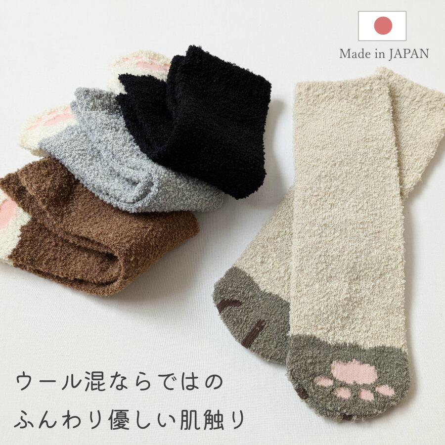 足裏の肉球デザインが可愛い猫柄のルームソックスです。モコモコのウール混素材を採用することで、暖かく肌触りの良い靴下に仕上げました。遊び心あふれるアニマル柄の毛混ルームソックスは、安心の日本製。素材選びから縫製・加工に至るまですべて日本国内で行っています。
