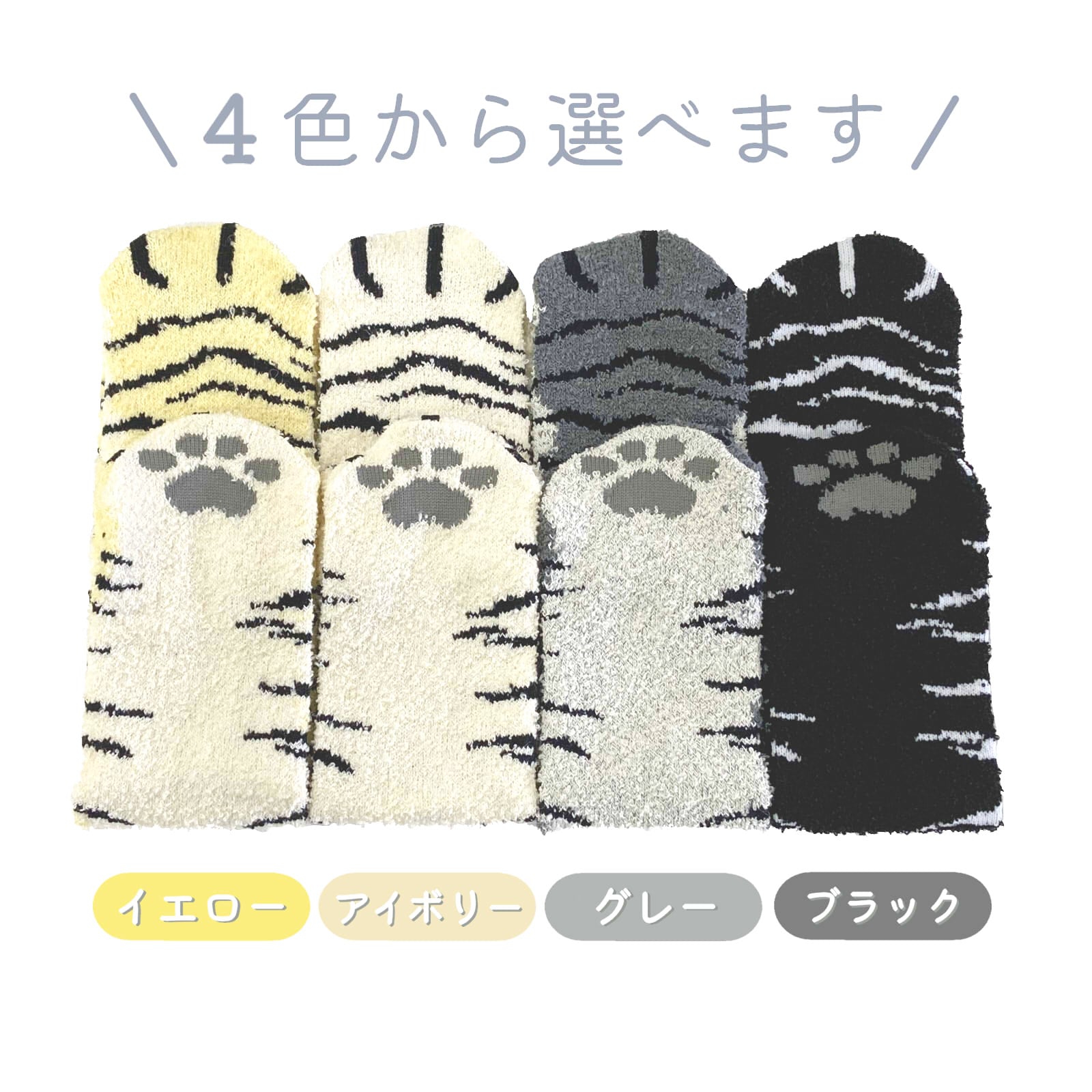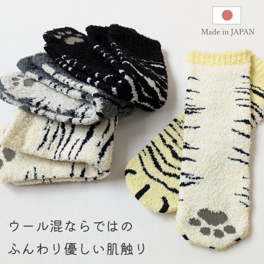 足裏の肉球デザインが可愛いトラ柄のルームソックスです。モコモコのウール混素材を採用することで、暖かく肌触りの良い靴下に仕上げました。遊び心あふれるアニマル柄の毛混ルームソックスは、安心の日本製。素材選びから縫製・加工に至るまですべて日本国内で行っています。